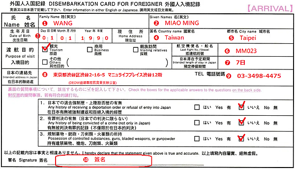 以下為入境卡填寫範例: