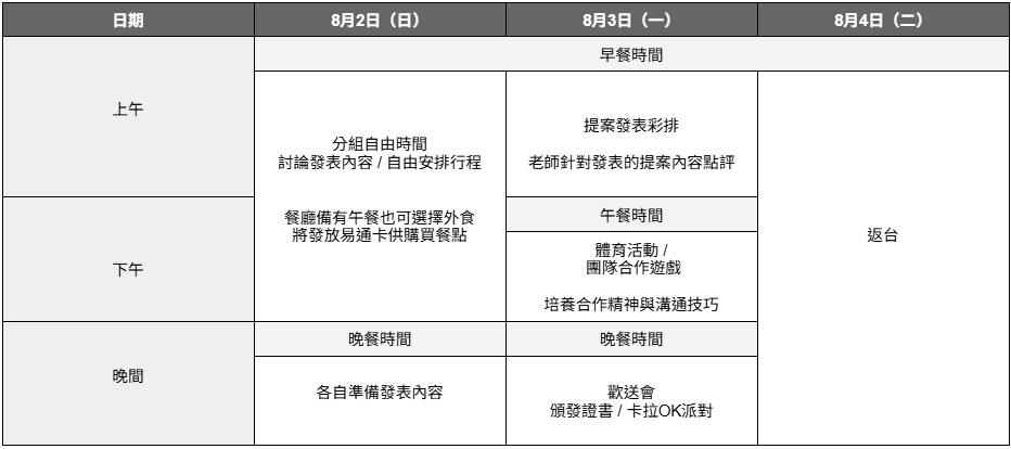 - 費用包含:課程、住宿、餐食、課外活動